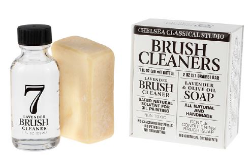 Nach der Reinigung mit dem Lösungsmittel empfiehlt sich die Verwendung der Chelsea Classical Studio Lavender & Olive Oil Soap™, um die Pinselhaare zusätzlich zu pflegen und mit Feuchtigkeit zu versorgen. Spülen Sie den Pinsel mit warmem Wasser aus, schäumen Sie ihn sanft mit der Seife ein und wiederholen Sie den Vorgang, bis der Schaum weiß bleibt und alle Pigmente entfernt sind. Anschließend gründlich mit warmem Wasser auswaschen.